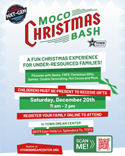 H-Town Dream Center’s MoCo Christmas Bash is a fun, joy-filled Christmas experience for under-resourced families across Montgomery County! This community celebration features pictures with Santa, free Christmas gifts, games, cookie decorating, hot cocoa, and more! Families are invited to join us on Saturday, December 20th, from 11 AM – 2 PM at the H-Town Dream Center, 26373 East Holly Ln., Splendora, TX 77372. To Sponsor or Register your family online go to Dream Center Christmas or scan the QR code on the flyer. Come celebrate the season of giving and experience the joy of Christmas together! *Children must be present to receive gifts.